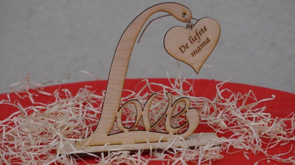 Mooie houten standaard met een los hartje er aan met de tekst "De liefste mama"